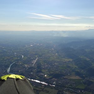 První let tohoto dne byl pouhý slet. Líbilo se mi to a získala jsem trochu více odvahy si to znova zopakovat. Po přistání jsme chvíli zevlili na přístavačce a pak nasedli do auta, nechali se vyvézt nahoru a znova se připravili na další let. Bylo něco po poledni a termika se zlepšovala a více a více padáku zůstavalo ve vzduchu a chytalo termiku. Odstartovala jsem. Koukala jsem se okolo na ostatní piloty, kde krouží a podle toho intuitivně naznala, kde by tak mohl být stoupák. Nějakou dobu jsem byla stále na stejné úrovni a nedařilo se mi naletět do stoupáku a vytočit ho nahoru. Prolítávala jsem stoupák sem a tam anebo jsem chytla jenom okraj a zase odlétla nebo jsem se nechala vykopnout dalšími piloty (v mém uvážení asi zkušenějšími). Chvíli to trvalo, než jsem se otrkala. Pak se to povedlo a chytla jsem svůj rytmus v jednom stoupáku a začala jsem pozvolna stoupat. Země se začala vzdalovat více a více a začala jsem vnímat, že jsem vysoko nad hřebenem masívu Grappy. Rozhlédla jsem se kolem sebe a uviděla v dáli panoráma Dolomit. Byl to krásný pohled na vápencové hory a v ten moment moje srdce zaplesalo. Jak jsem se stále soustředila na termiku a točení stoupáků, úplně jsem zapomněla na čas. Začalo mi být trochu chladno. Neoblékla jsem se pořádně, nepočítala jsem, že vystoupám tak vysoko a zůstanu ve vzduchu dlouho už druhý let. Radost z toho, jak se mi dařilo udržet se v termice, chvílemi klesat a pak zase stoupat, se mi nechtělo z těchto výšit vůbec dolů. Odřezávající prsty na rukou a nohou mi naznačovaly, že by možná byl čas slétnout dolu. Přistála jsem celá rozzářená a šťastná a radovala jsem se jak dlouho a vysoko jsem vystoupala a co jsem zahlédla.